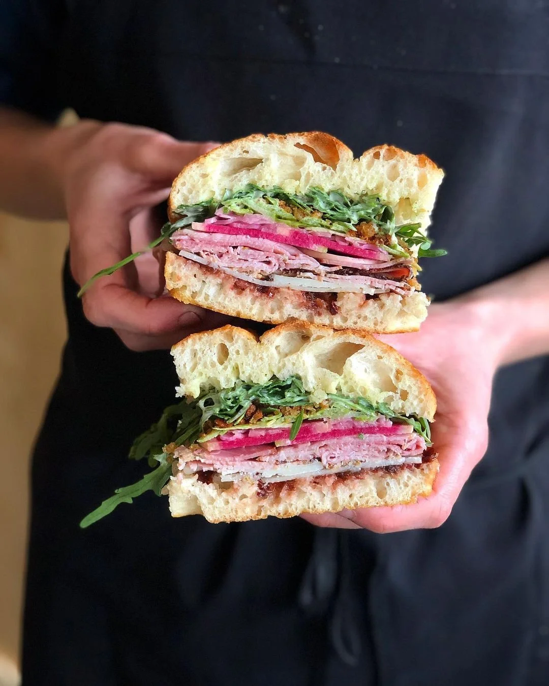 For the second year Poppy is filling their ‘Rhubarbra Streisand’ with my favorite VSP conserve. Co-owners of Poppy, Abby and Emily Portman, opened their shop during Covid and immediately started selling out of their stacked, juicy, veg forward sandwiches. They instantly established themselves as experts on crafting the perfect textural and flavor cross sections and their sammy cutaways on IG are local legend. Behold…